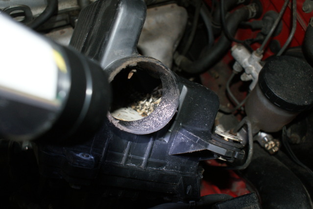 Well had some time in between studying for finals tonight to start tearing areas in the engine bay down first starting with the headers. Found some interesting things in the intake box...