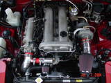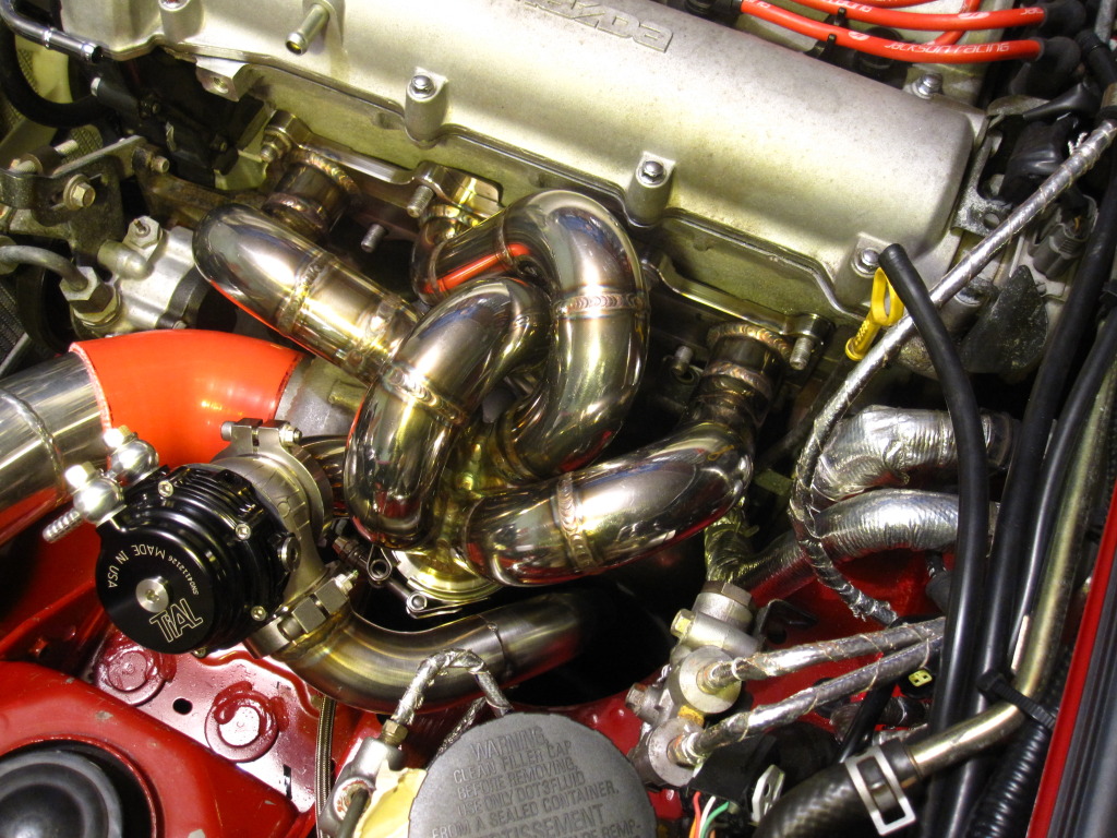 My first turbo setup was a custom T3/T4 40 trim, which pretty much sucked. It was based on an ETD racing long tube manifold, ebay intercooler, all custom plumbing and a LINK ecu with RC 550s and a Walbro 190 HP. Made 227 hp (forget the torque - 190?) at 14 psi.