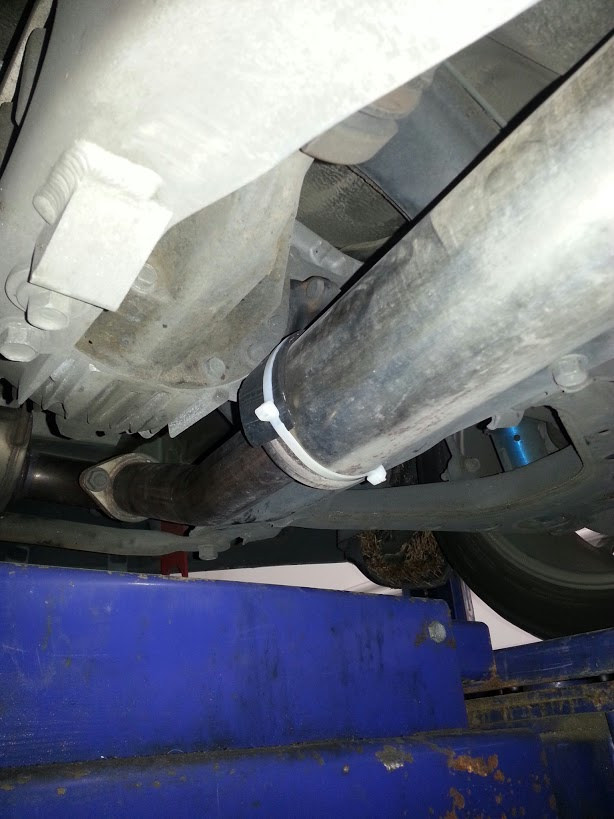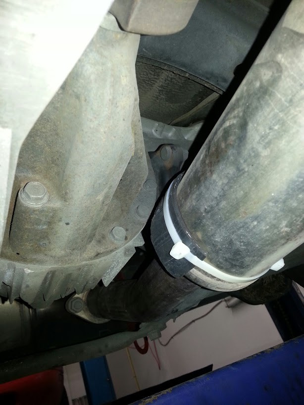 Are you talking about the ziptie and the rubber? that was just to serve as padding, to keep it from denting when the exhaust was knocking against the diff. It was taken off after the flanges on the test pipe were modified. The before and after pics just show the gap distance. However, it still knocks a couple times under load