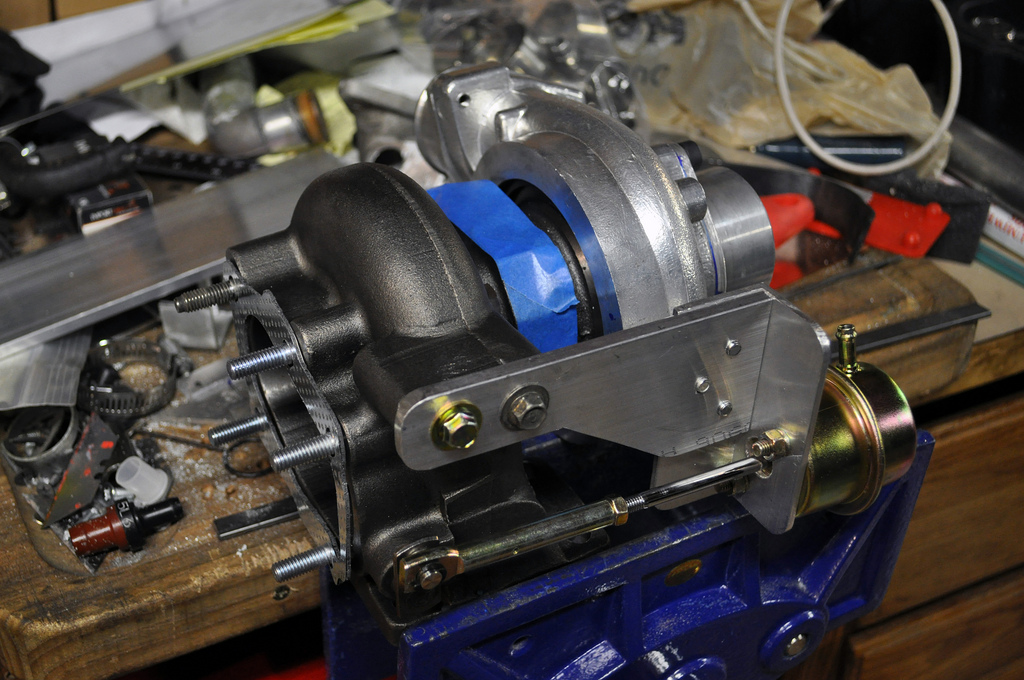 My original plan was to use a Garrett T25 off a bluebird SR20, but when we tried to clock it, it was seized. So I decided to grab my cousin's chinacharger and had to make a custom bracket for the wastegate actuator