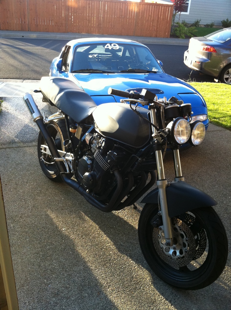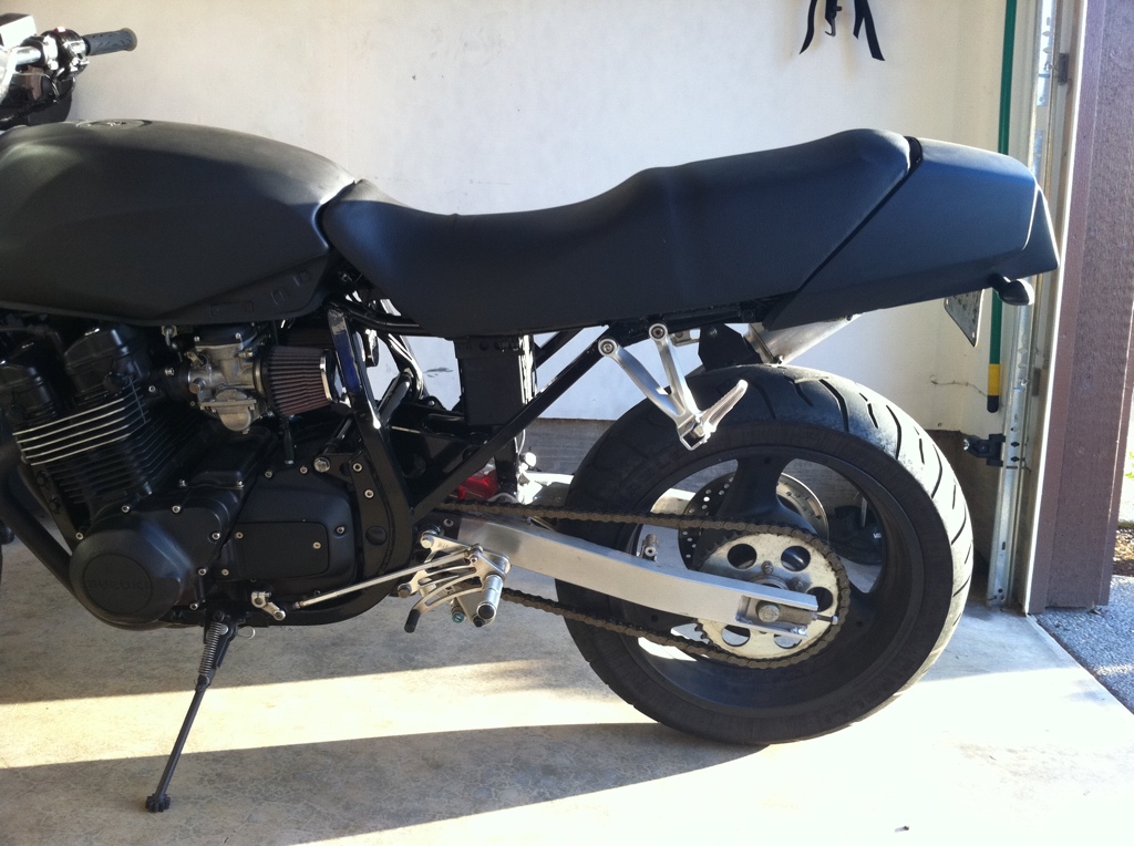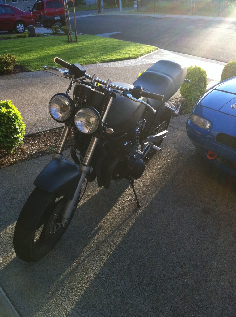 That's about all the major stuff. Everything is stainless steel hardware, engine's been gone through with a few new gaskets and rings, carbs recently cleaned, seat reupholstered, wiring harness is a brand new OEM unit as of ~3 years ago, frame, all brackets, and swingarm was powder coated shiny black ~2 years ago, K&N filters, yoshi exhaust, early '90's GSXR rear wheel, R1 shock, early '90's Katana 600 front end (wheel, calipers, brakes, master cylinder, gauges), SS lines front and back, new battery, starter solenoid, Honda RR, new oil lines. And that's enough off the top of my head for now.