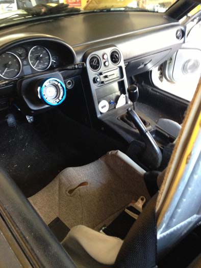 INTERIOR- 2 Kirkey aluminum drag seat with grey tweed covers. No radio. AC completely removed, including adding the mazda air tube under the dash in replace of the evaporator. No name steering wheel with with NRG quick release adapter. Stock passengers seatbelt with 4 point on drivers side. Innovative air/flow quage. Flip switch for electric fan. Battery is Odyssey and in a spec miata battery box