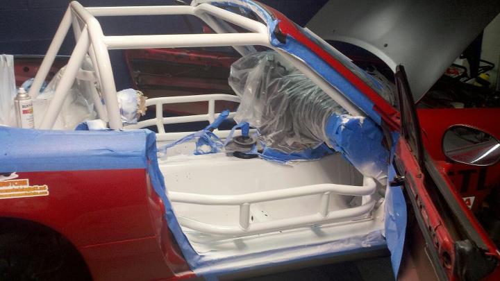 The paint is in fair condition; has a few nicks, dents, chips and scratches. Hardtop was recently repainted flat black to match the hood, but there are a few cracks in the paint on the hardtop due to a little flex from racing. Those were touched up with touch up paint, but up close you can still see it. The metal behind the rear finish panel isn't completely straight - looks like the previous owner got bumped on track. The rear finish panel is spray painted black. The paint is actually in decent shape everywhere else though. Oh, and the interior isnt professionally painted - I used a can of white rustoleum gloss paint and a foam roller, but it actually turned out pretty decent and has several coats on it. There's a slight oil weep from the crank seal area on the engine, but I don't have any drops on the ground, so It's not a concern for me at the moment.