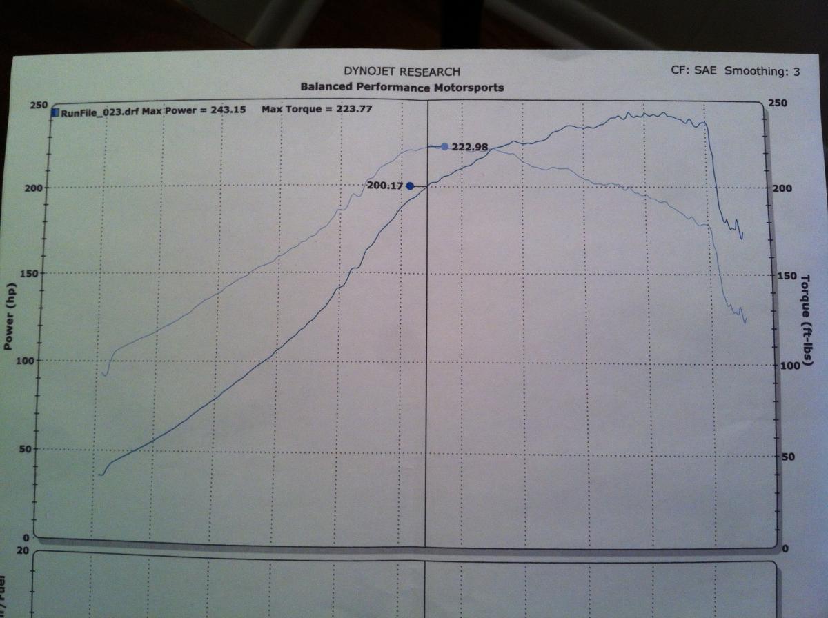 Dyno'd 11/18/11 243WHP 223Ft/lbs torque @ 13psi while spinning the tires on the dyno