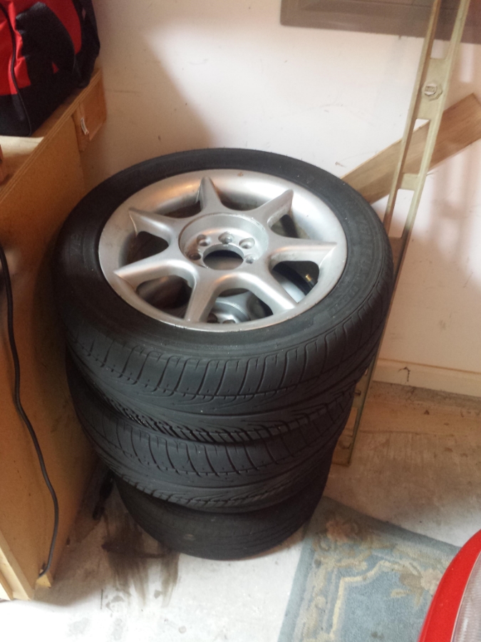 -4 spare wheels. 2 decent tires (same that are on rear of car, 2 bald)