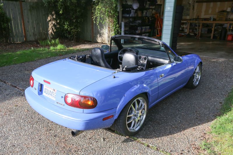 This car was originally created by Mark Snell, who did most of the fab work to get this car running in the first place. It was designed as an SSM autocross powertrain test mule for the KL-DE V6 motor that lives within it. I bought the car to finish the project, but then decided to go another direction for SSM and turned this car into a finished street car. I re-added a stereo, a brand new top of the line soft top (big glass window!), fabbed a custom intake manifold, created a great cooling system, and now the car runs and drives like a normal Miata, except with more torque. I commute in this car to work, I drive it to get groceries, and I've left it at the airport park and ride for a week in the rain. The car passes WA emissions cleanly.