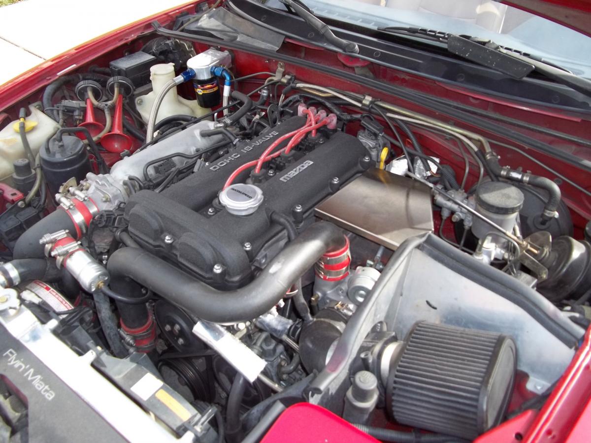 Power mirrors, AC, cruise, power steering, LSD, R pkg front spoiler, new top, 2001 tan leather seats (just added), Monte Carlo steering wheel, HD Deuce polished roll bar, 15x7 Panasports w/Kuhmo tires, RB sways, VDO gauges (water temp, oil temp, boost), AEM A/F gauge, Koni shocks, BEGI IV.2 turbo (CARB legal!) GT2560R running 10psi, Xede computer, Hallman boost controller, FM heavy duty street clutch, Koyo 37mm aluminum radiator, Gates racing timing belt (done 20k miles ago), FM remote oil filter, Vishnu duel feed fuel rail w/FM stainless fuel line kit, M-tuned coolant reroute, FM cat, FM single turbo exhaust, Magnecor plug wires, Black Voodoo shift ****, CIBIE halogen headlights, Italian air horns, Kenwood HU, Hood strut, stainless door sills, spare motor.