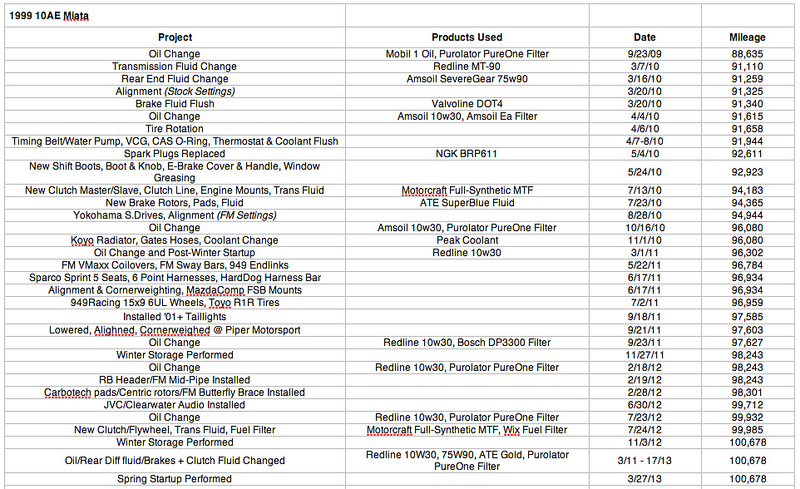 I performed most of the modifications under my ownership within the last 5k miles; almost all of the work that wasn't performed in my home garage was either done by Piper Motorsport, a very highly respected Mid-Atlantic race/fabrication shop, or York Automotive, a well known Spec/street Miata shop in Maryland. Its setup to be a fun, reliable autocross/HPDE track car and its definitely been maintained as a proper enthusiast's car would - an extensive list of maintenance has been performed under my ownership and there is literally nothing the car needs at this point, its in top condition.