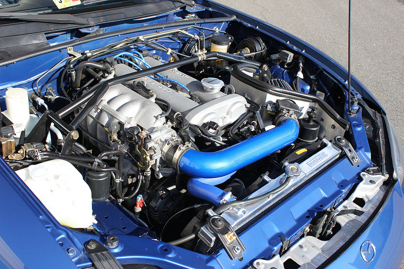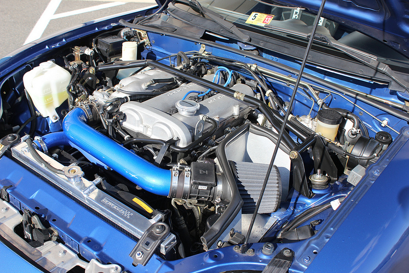 The hoses/belts are good to go and are regularly checked over to ensure so, the fluids are always replaced on schedule, and the engine bay is regularly cleaned just like the exterior of the car. I've rarely if ever seen a better looking Miata engine bay. The exhaust combination installed in the car consists of high quality pieces that results in a good, sporty tone without being over the top.