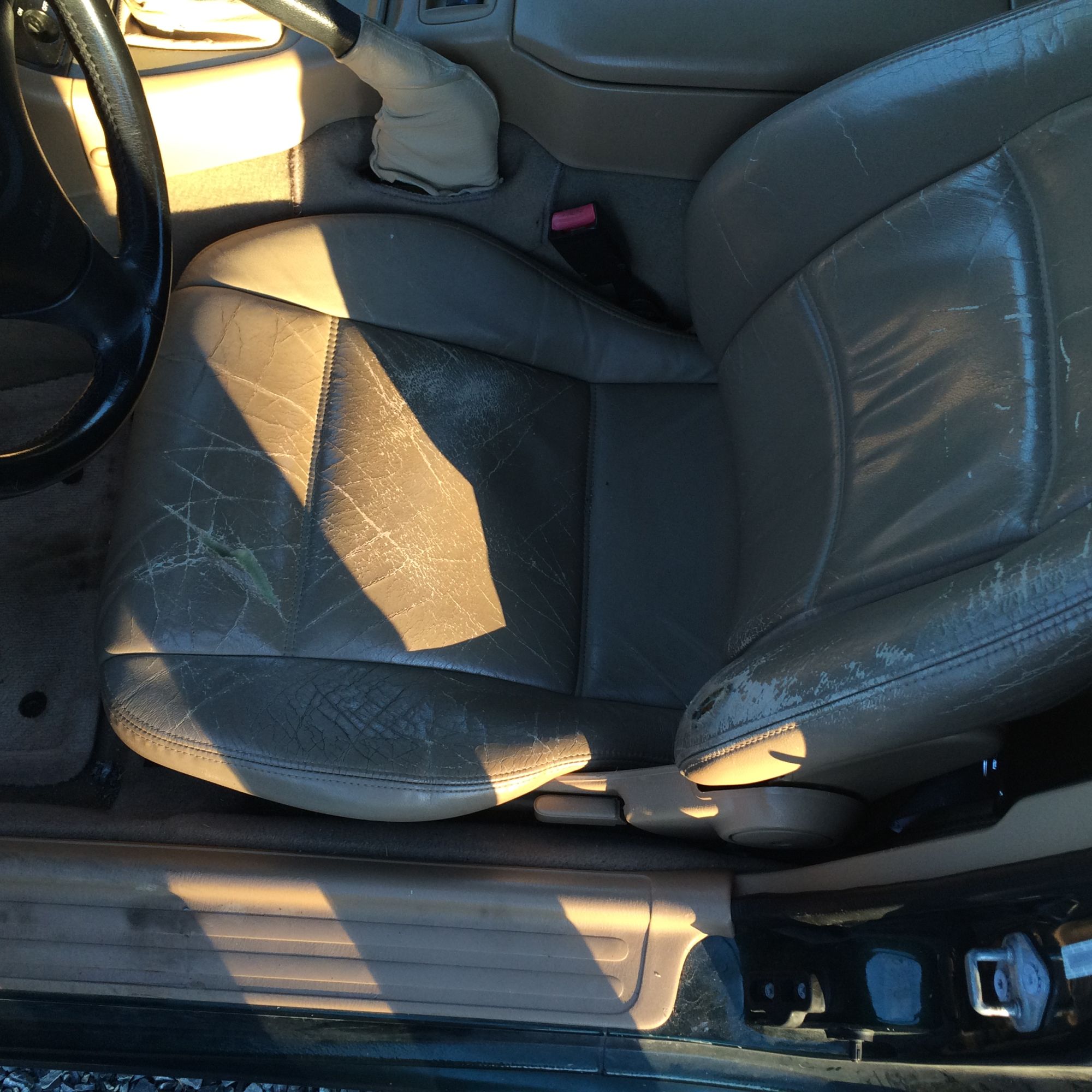 The seats are shot. The leather is cracked and split. The driver’s seat is worse than the passenger’s seat but neither are great. I’m not an upholstery guy, but the seats don’t seem fixable, at least not easily. If I were to keep the car I would look to replace them with another good condition set out of a different car. There are some other interior issues, the shift boot is torn and the carpet is dirty/stained. The leather on the steering wheel is a little worn.