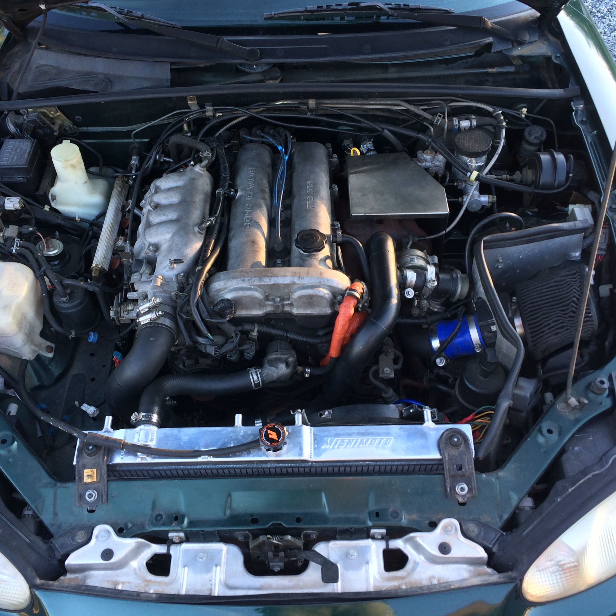 The car has A/C and powersteering and they both work great. I’m too old to have a car that doesn’t have A/C, and finding a turbo miata with good working AC isn’t always easy. I’ve added a Mishimoto high capacity radiator to help deal with the extra cooling needs added by the turbo system. I modified an OEM Honda Prelude radiator fan and shroud to fit the new radiator.