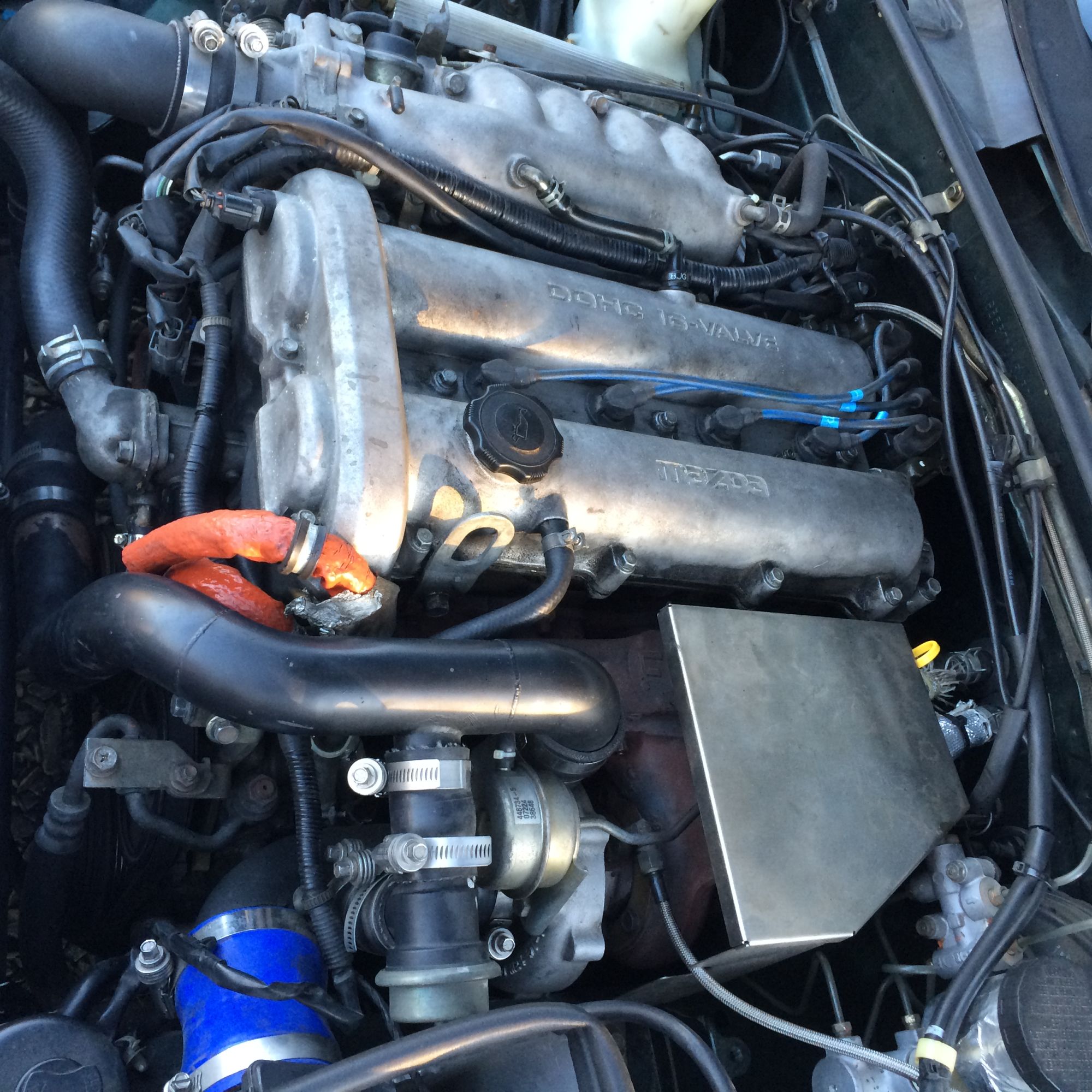It has a turbo. Turbos make miatas better. Turbos make miatas faster than minivans, which is a good thing. The turbo kit on this car is an older version of the Flyin Miata FMII kit. If you don’t know anything about turbo miatas or Flyin Miata, google it now and check the website out for a few minutes, and then come back. Flyin Miata makes awesome turbo kits and are one of "the" companies to go to for an off-the-shelf, high quality, reliable turbo system.