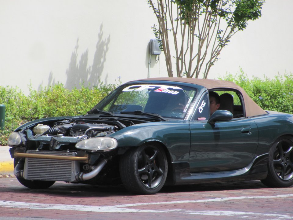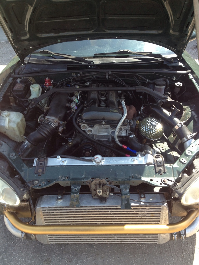 Hey guys god has given me a sign and doesn't want me to drive a miata any more. So I've come to the decision of selling the car. I was in a drift event Last night and hit the wall on the rear drivers side quarter panel damage is fixable i just don't have the time not the patience to get it fixed. The car has an nissan sr20det motor swap with everything Solid. That's solid engine mounts, tranny mounts, diff mounts. Custom Drive shaft, Custom Oil pan. Stock turbo manifold, Garrett gt2871r BB, Tomei 740cc injectors, R.S. Enthalpy tune... Greddy profec II boost controller, AEM wide Band, some boost guage, Alpine radio. Woodgrain interior. Custom Oil Catch Can, and a whole bunch of other stuff. Im asking 6k or straight up trade for a regular people car. Now on to the pics.