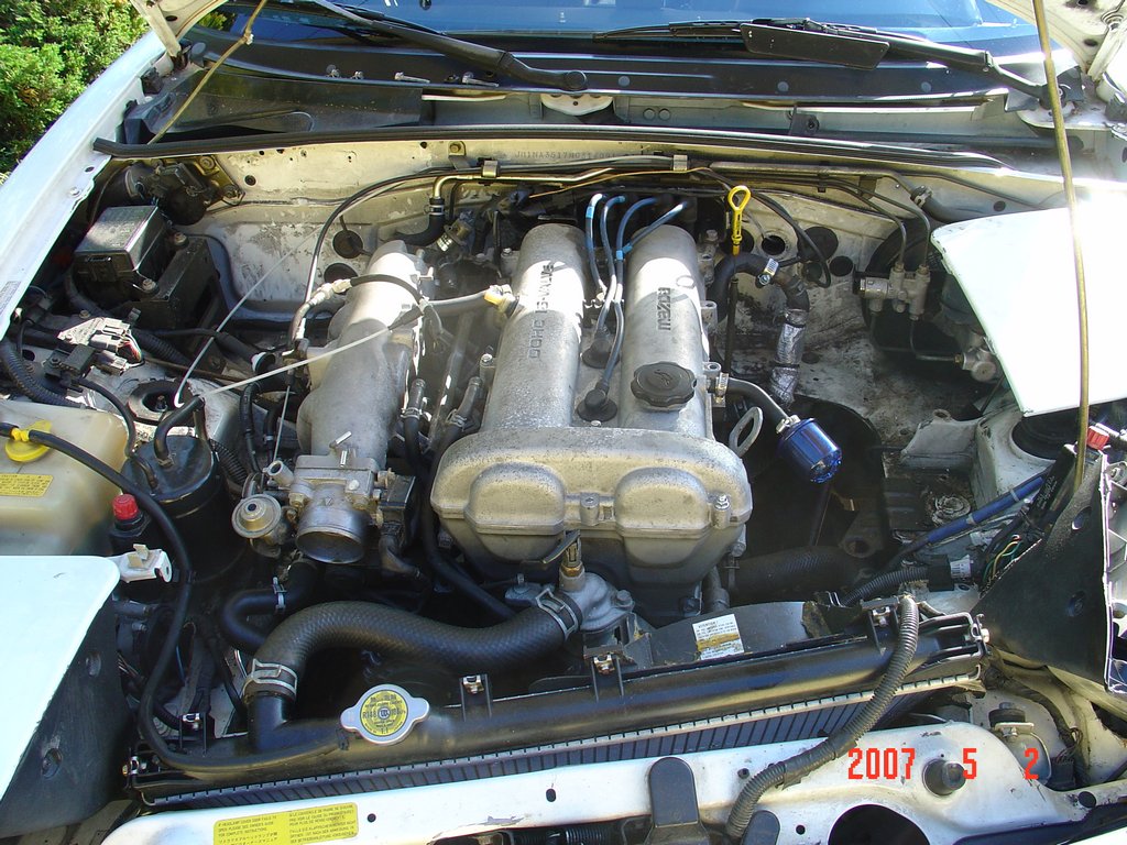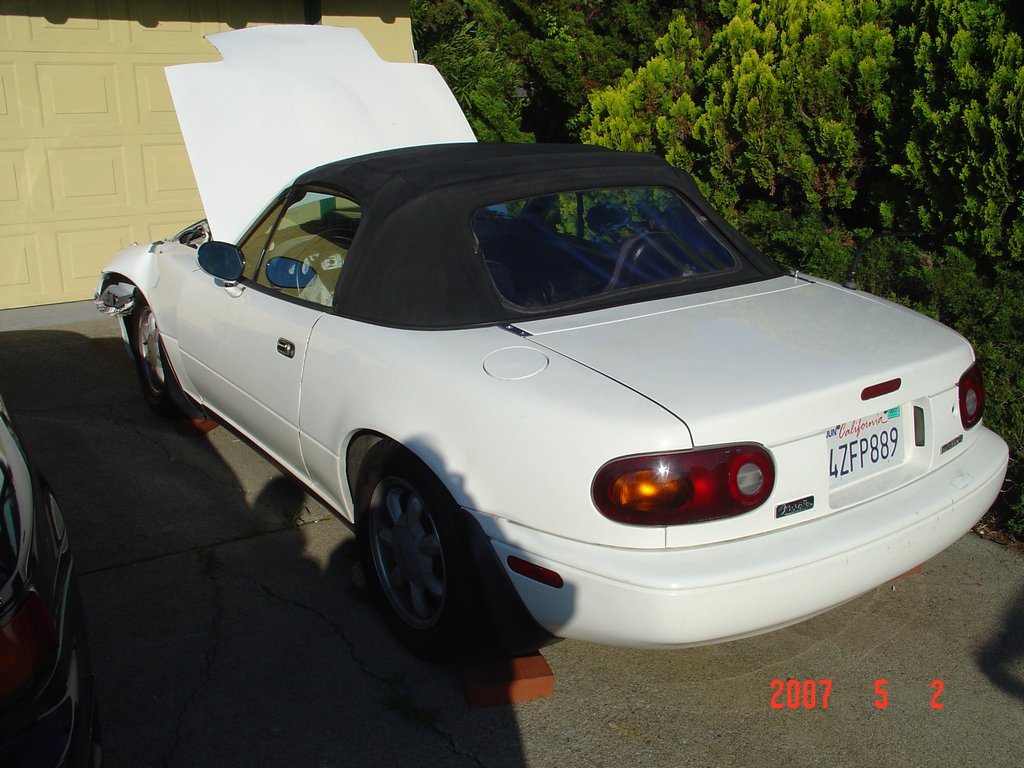 I have a 92 white miata wreck in the driver side front, rest of the body is good, I have the engine in good condition,transmission, wheels, I took the turbo off, I have the exhaust out the car 2.5 turbo piping(custom) n1 muffler, but will give it upon request.If anyone lives in the bay area, Iam selling the whole car for $200 local pickup, Iam in the bay area,california.If you guys are interested will take more pics.