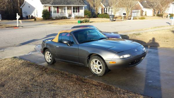 97 Mazda Miata, $3200, 135k miles, Silver, 5 speed, cold AC, great top with glass window. Hard Dog Hard Core M2 double diagonal roll bar, AGX shocks, Flying Miata front and rear sway bars.