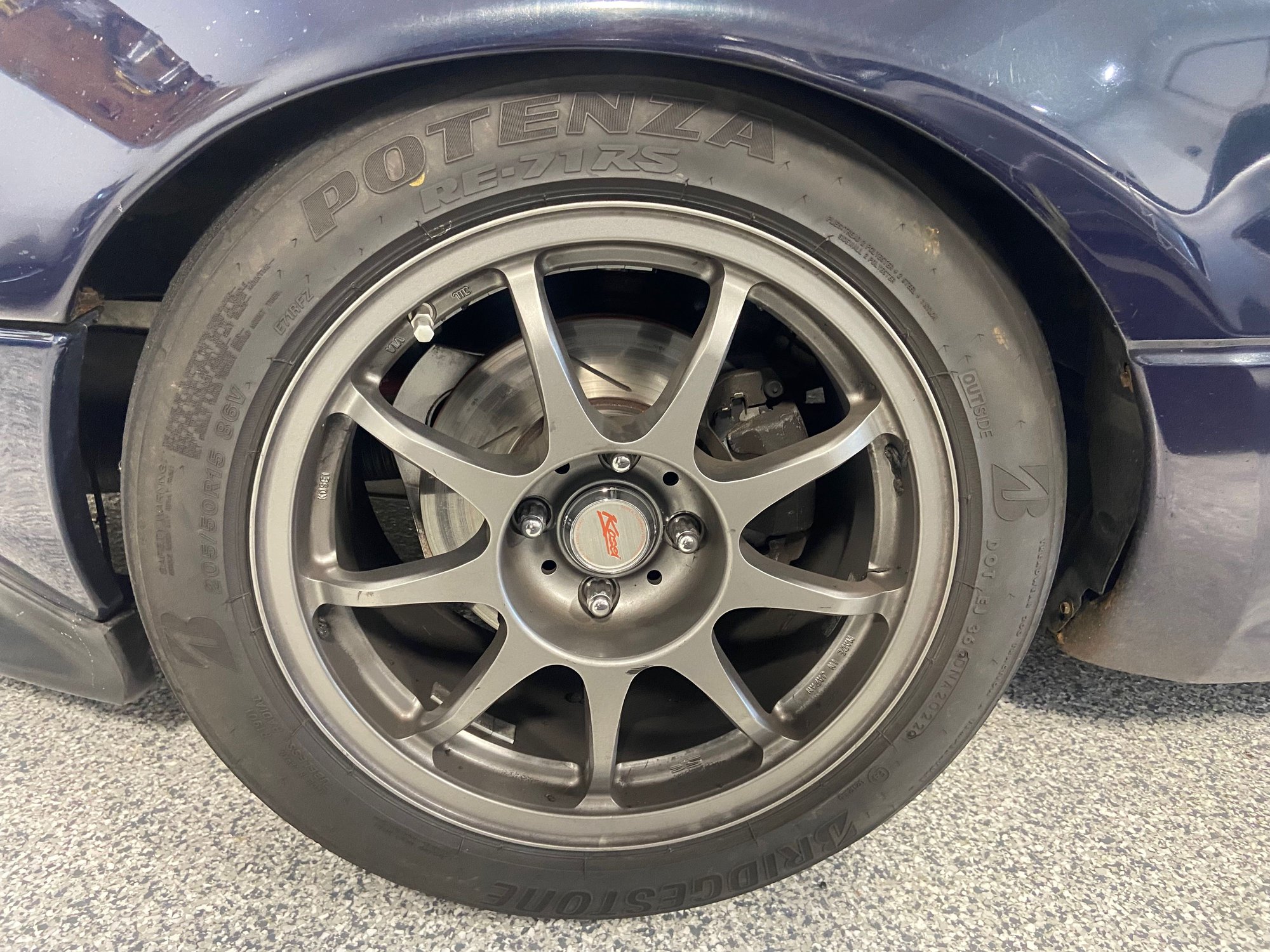 Fenders are rolled. Driver side front fender is replacement due a spin after the car in front of me dropped a coolant hose at the bottom of the down hill at Lime Rock. Spray painted the replacement, as you can see in the pictures. This is a track-day car, not a show car. :-) All wheel well rust repaired but notice a small outside bubble in the pic of the driver's side rear tire.