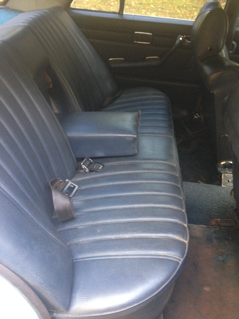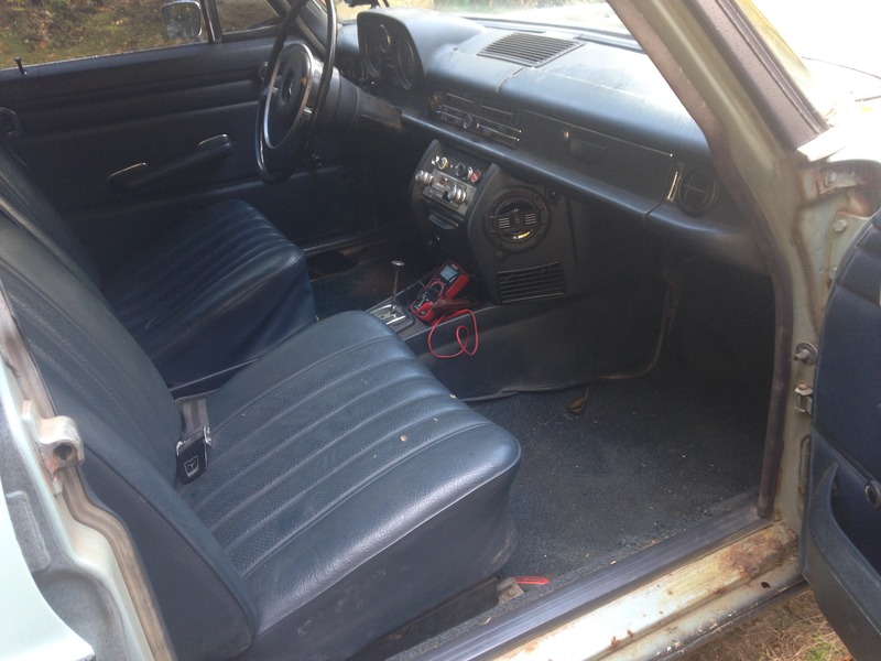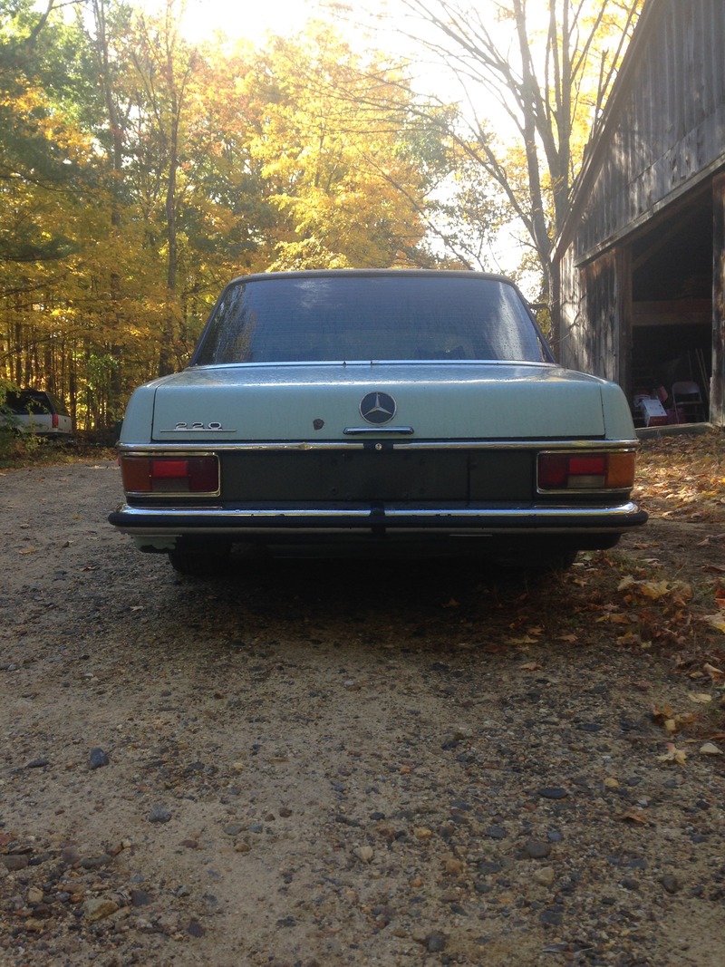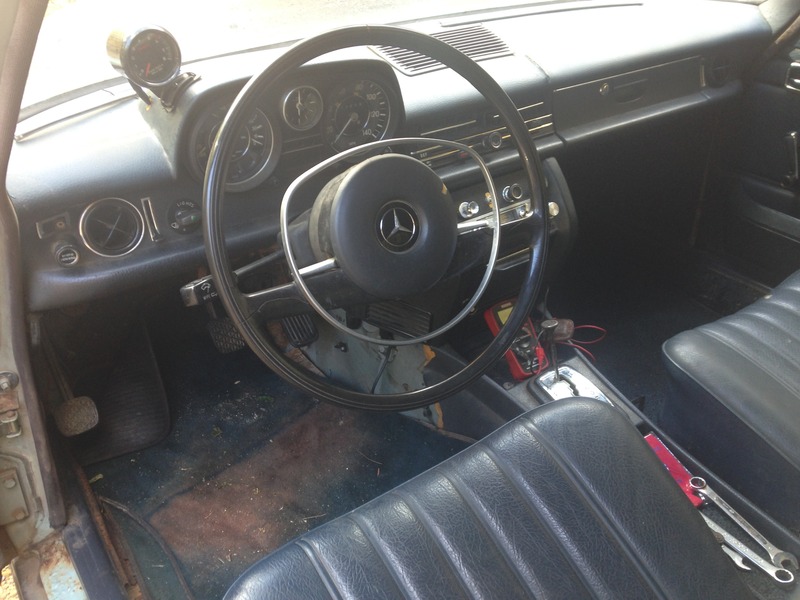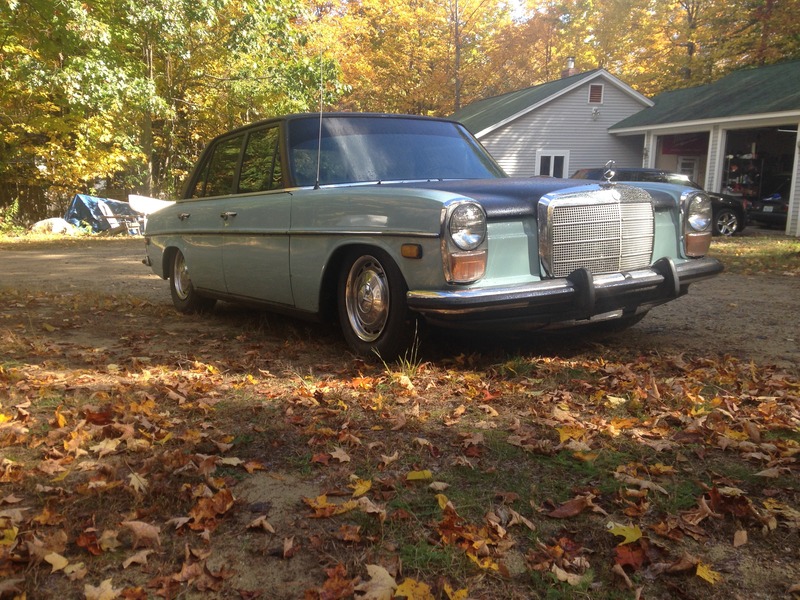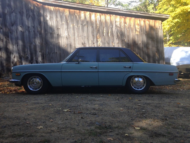 1972 Mercedes 220 sedan- Horizon Blue body, with a black flaked hood, roof, and some minor trim accents. Blue interior, tinted windows. This thing is slammed to the ground on the original Mercedes wheels. Everything electrical is working except for an aftermarket tach which needs to be wired up. Wipers are currently not installed, but they do function. (They are also in the trunk). There is a newer radio in the car as well, not that you'll be able to hear it over the roar of the exhaust!