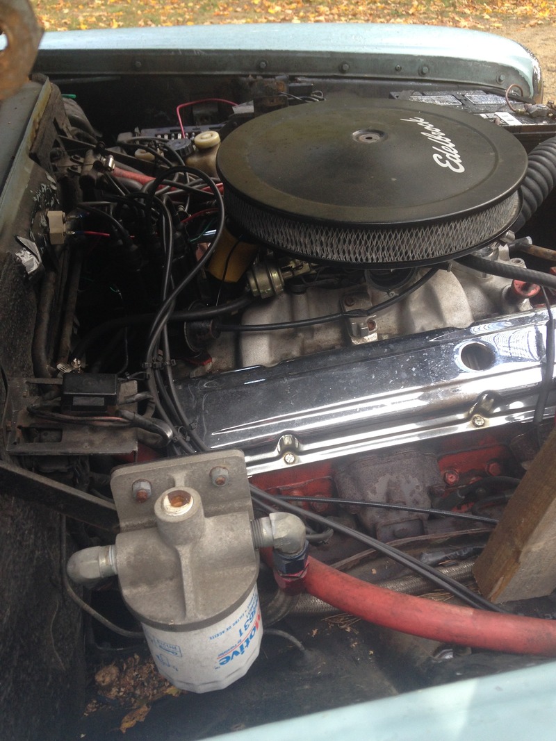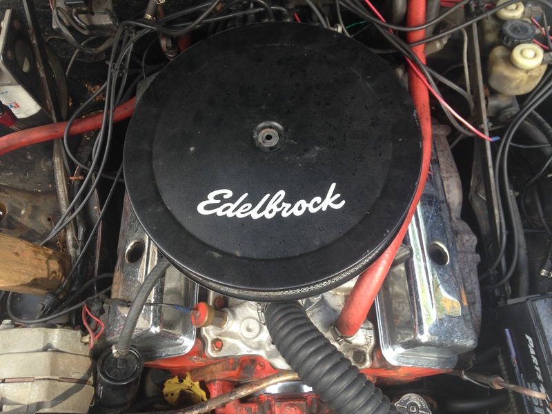 Engine is a small block chevy 350. It's got an edlebrock intake, carb, and air cleaner. This thing also has one of the nastiest cams you will ever hear- and hear it you will as it has straight pipes that exit just in front of the passenger rear wheel. It's been rebuilt at some point in time, but the actual miles on the engine are unknown. There is an electric fan in place of the mechanical one as well as a remote oil filter setup with stainless braided lines. It's got a turbo 350 automatic transmission, and a custom driveshaft was made up as well as custom motor and transmission mounts. The firewall also has some additional bracing added to cope with the stress from all this horsepower.