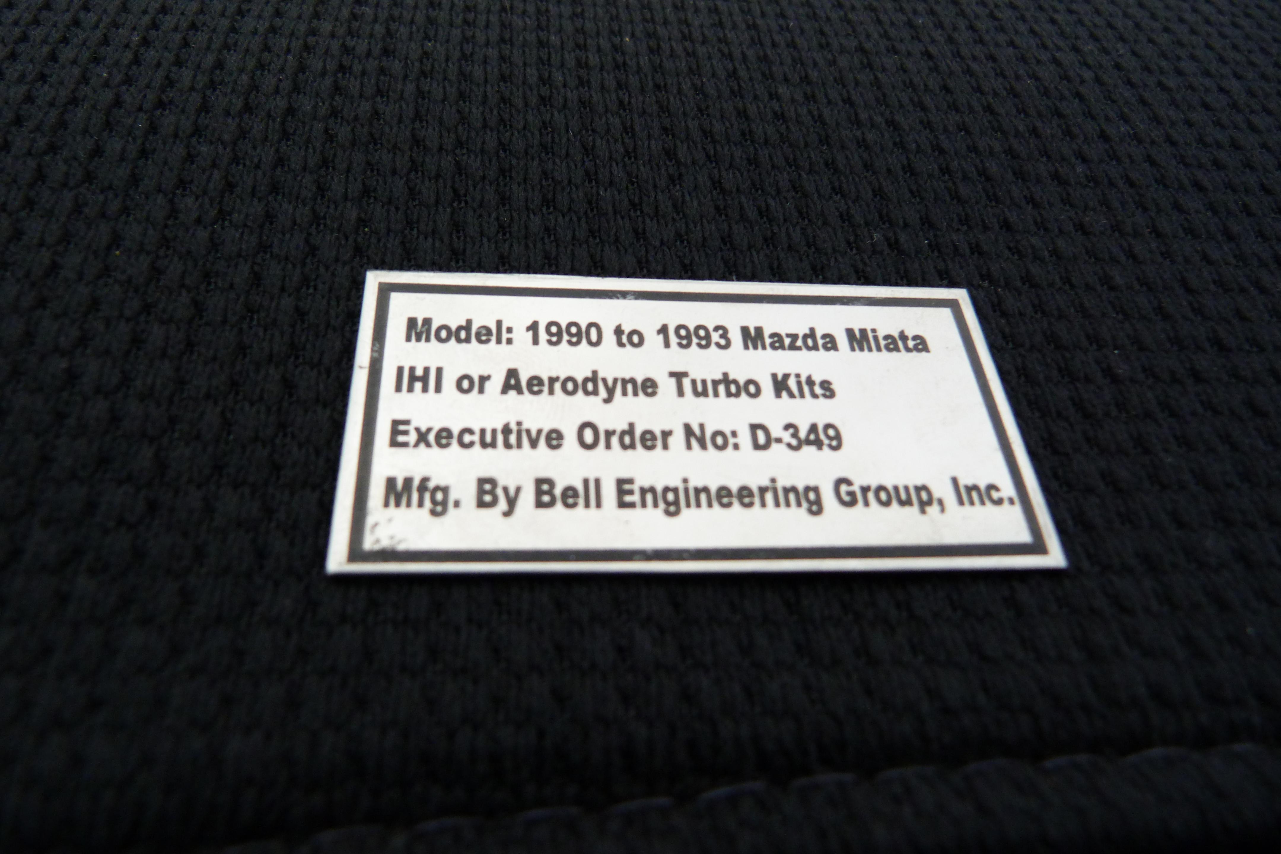 - Begi (CARB legal) turbo (Garrett GT2554) with ball bearings and water cooling ($3695); ceramic coated turbine housing; cast iron exhaust manifold, ceramic coated exhaust manifold, FMIC, FPR; metal CARB EO decal (see pics) @ 180-190 whp, responsive in low-mid range, link to S1 system: BEGi S1 Miata Turbo System