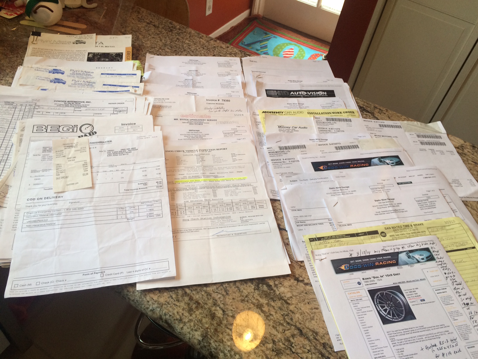 Upgrades and maintenance I did w/in last 16 months & 5,000 miles (I have receipts from Miata specialist mechanic garages SBGarage and Static Nine in South San Francisco - SBGarage - Automotive Repair, oem parts, aftermarket parts and much more! ) - about $11,286 in receipts for maintenance, parts, labor for past 16 months, nothing needs to be done but drive - see receipts photo: