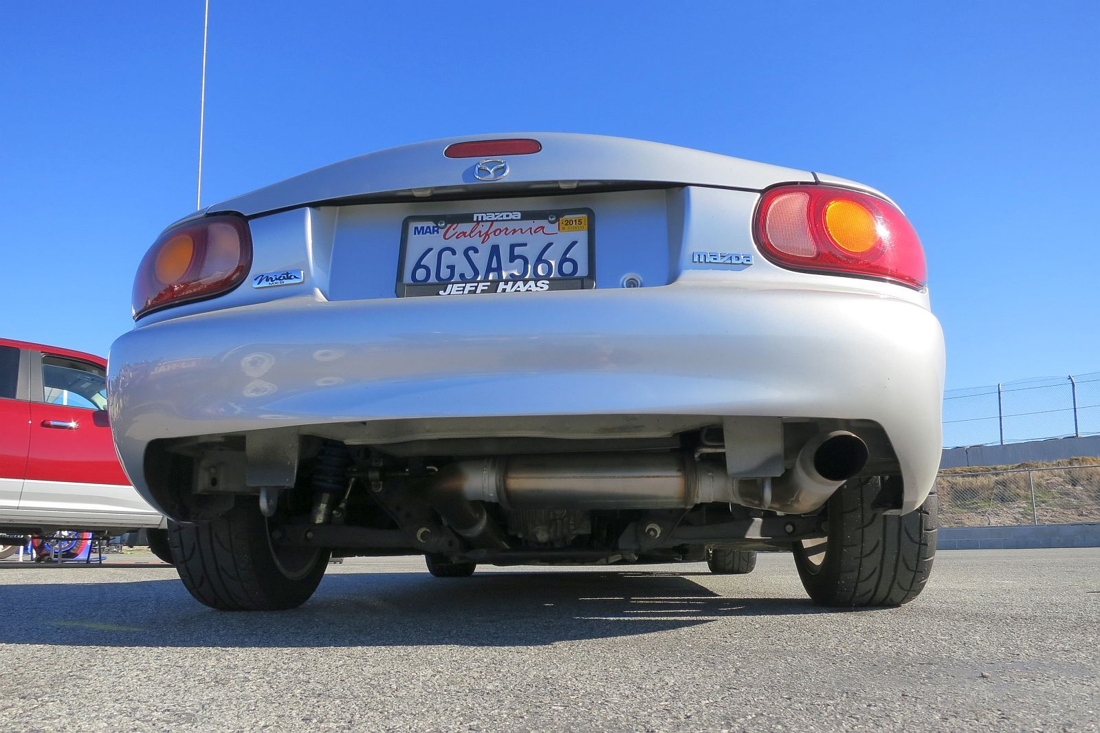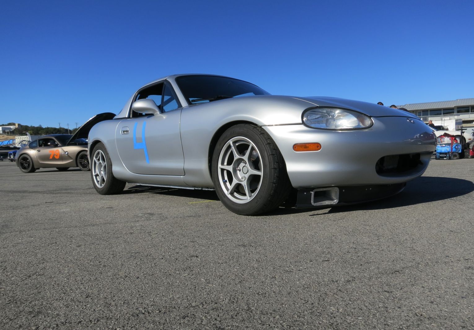 Koyo aluminum radiator, coolant re-route kit, ACT clutch and flywheel, Torsen limited-slip differential. Bilstein PSS9 coilovers, Kosei K1 15x7 wheels, Dunlop Direzza Sport Star Spec tires, Flyin' Miata front/rear adjustable anti-roll bars with Racing Beat poly end links, front shock tower brace, Flyin' Miata underbody butterfly brace, steering rack de-powered by Blackbird Fabworx, Blackbird Fabworx rear bumper cut,