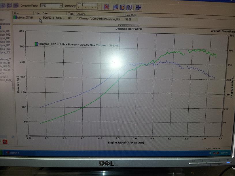 That is a pic of the first dyno. The shop I went to didnt have a printer hooked up.......thats a street tune. Obviously can use some fine adjustments. And that is on 91 pump gas.