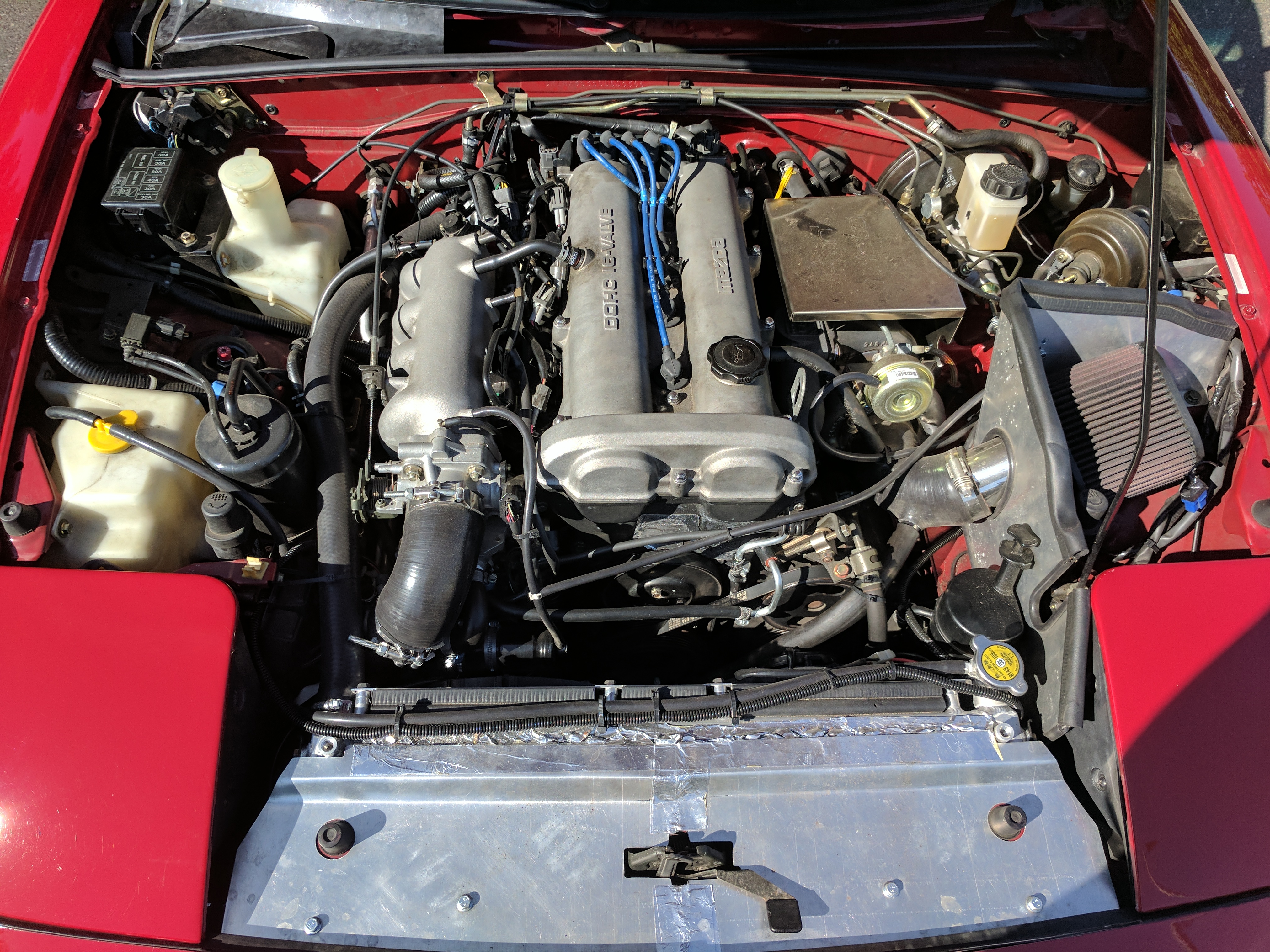 Flyin Miata FMII turbo kit (w/ no electronics)Enhanced Megasquirt II ECU from MSlabs / revenantFuel Injector Clinic injectors - 650 cc I believe, but I'll need to double checkFlyin Miata Stainless steel exhaust (2.5" from turbo to high flow cat, 3" from cat back)Flyin Miata crossflow radiator with upgraded cooling and AC fansFlyin Miata stage 2.5 suspension kit with Tokico shocks, larger swaybars, and FM upgraded rear upper shock mountsFlyin Miata four wheel little big brake kit with parking brakeFlyin Miata frame railsFlyin Miata lightweight flywheel & clutch "happy meal"Flyin Miata clutch switch overrideFlyin Miata gas pedal extenderHard dog hard core roll bar with additional harness barWilwood brake proportioning valveSwapped out the brake booster for the factory brake booster with lower assist and factory master cylinder (for better brake pedal modulation)Flyin Miata master cylinder braceMazdaspeed motor mountsGarage Star door bushings (From FM)Flyin Miata coolant re-route kitTrack tow hooks front and rearDucted front brake cooling shroudsCustom built aluminum engine cooling shroud for improved engine cooling (ZERO overheating issues at track days running up to 45 min sessions)Replaced oil pressure dummy gauge with OEM part that shows actual oil pressure15x7.5 TRMotorsports wheels with BFGoodrich G-Force Rival tires