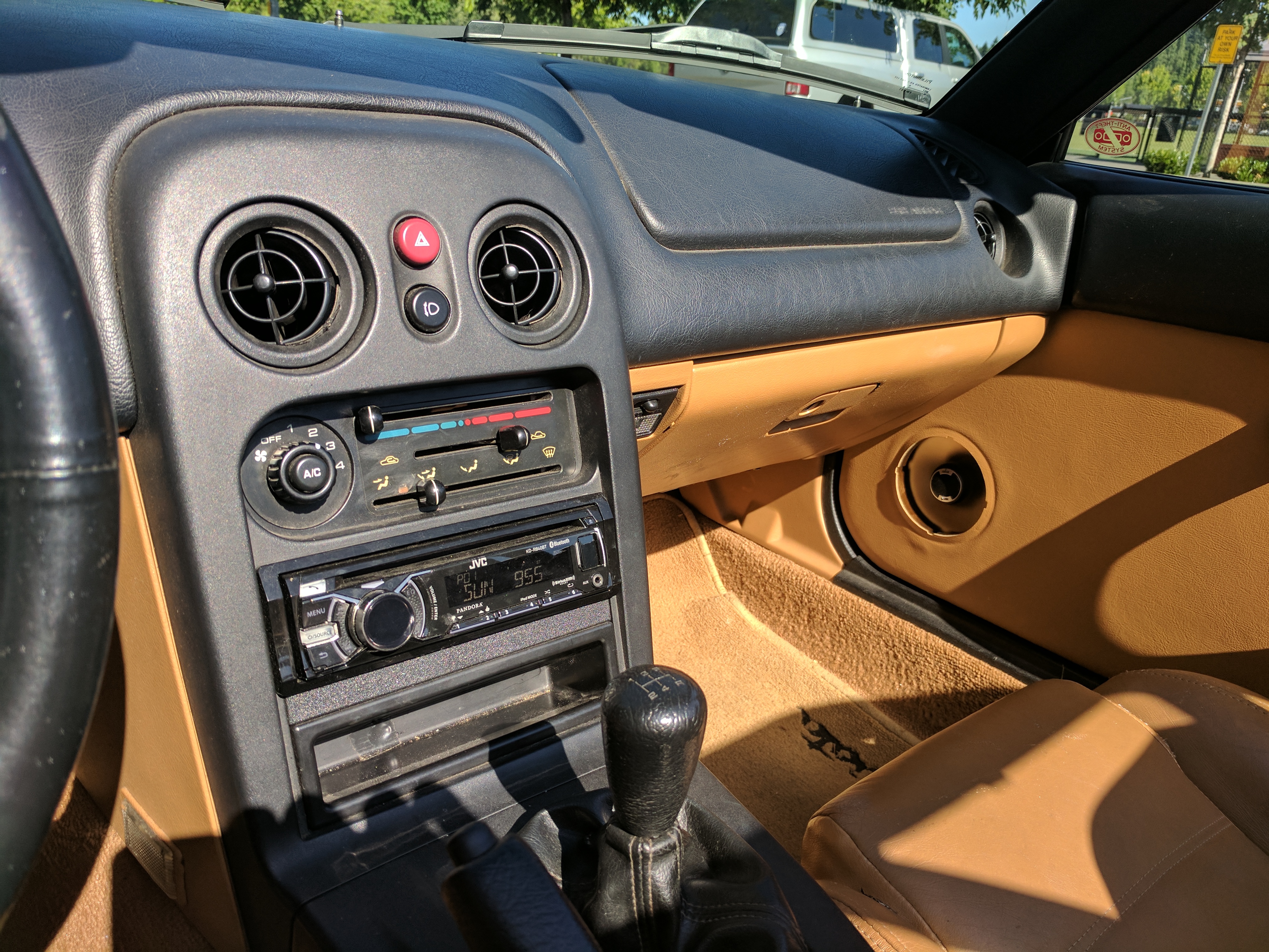 The car has a tan leather interior with matching tan soft top. The soft top has a zip out glass window with defroster (car has the defroster cable and controls). The car has air conditioning, power steering, cruise control, and a factory LSD. I've upgraded the stereo to a JVC unit with CD player, ipod connection, bluetooth, AUX and USB input. I've also upgrade the door speakers and rewired the headrest speakers in the factory seats. I performed a "foamectomy" on the drivers seat. The car has ~139000 miles and has had the turbo for 4 years. There are no mechanical issues, and the car runs well. Here is a list of upgrades that I have made to the car: