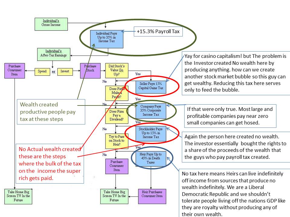 Your chart is not quite the whole truth or even reality. It’s not always the same person making the money at every step of the way from top to bottom and I will again pick on hedge fund managers who use leveraged money and only collect income in the form of long term capital gains along the way, also the trust fund babies who never really earned there own welth. Once you have some welth bult up you can avoid the higher tax productive steps all together.