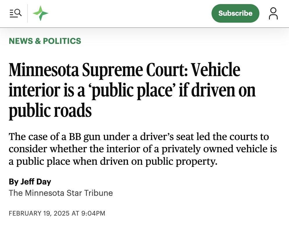 (Minnesota Star Tribune headline about a catalytic converter thief being arrested for possessing a concealed firearm under the seat of his car)