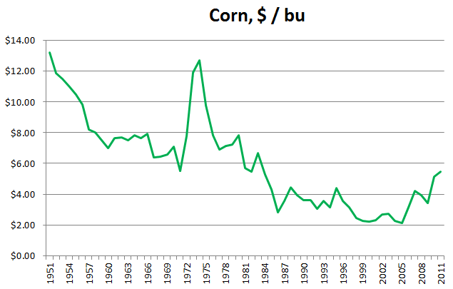 Here is the spot price of corn, in inflation-adjusted dollars per bushel, from 1950 to the present day: