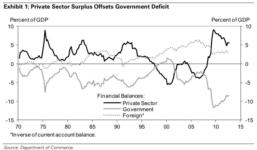 "...every dollar of government deficits has to be offset with private sector surpluses purely from an accounting standpoint, because one sector’s income is another sector’s spending, so it all has to add up to zero. That’s the starting point. It’s a truism, basically. Where it goes from being a truism and an accounting identity to an economic relationship is once you recognize that cyclical impulses to the economy depend on desired changes in these sector's financial balances."
