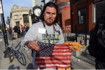 Later he is pictured, hours laters, still walking around looking for people to take picutes of him and holding a small US flag he never let go of that is covered in red ink. I say ink because it looks like ink, not blood.