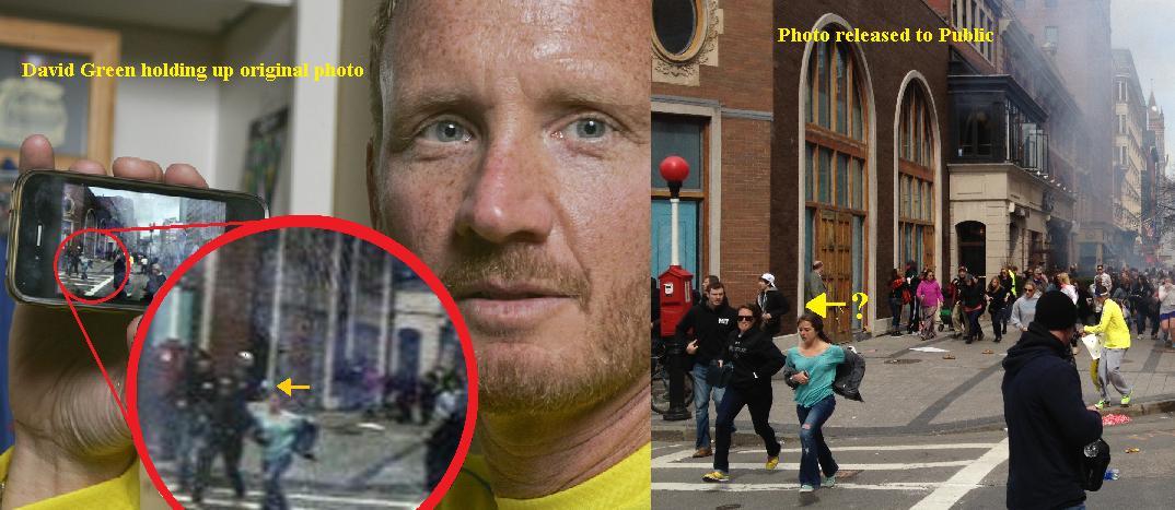 I think the implication is that in the grainy photo he has a backpack on (or that is the idea anyway, you cant really see anything) and in the released photo he doesn't making it a photoshop setup job.