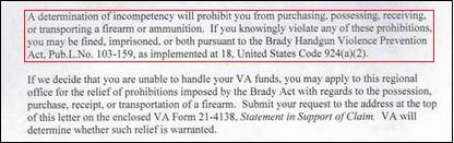 Basically, if the VA, through an enormously long process determines that you are not competent to handle your own personal affairs and you become somebody's "ward", you may not own guns. This process has a lot of voluntary parts to it, and is only ever really used if somebody is so fucked up that are a serious danger to themselves. In other words, it's a good thing, and it's a very difficult thing to do without the persons cooperation.
