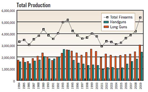The graph of gun production indicates the beginning of the gun recession at about 1994. That recession appears to have ended around 2004 when it started increasing again. That 10-year time period is of significant relevance to the firearms industry.