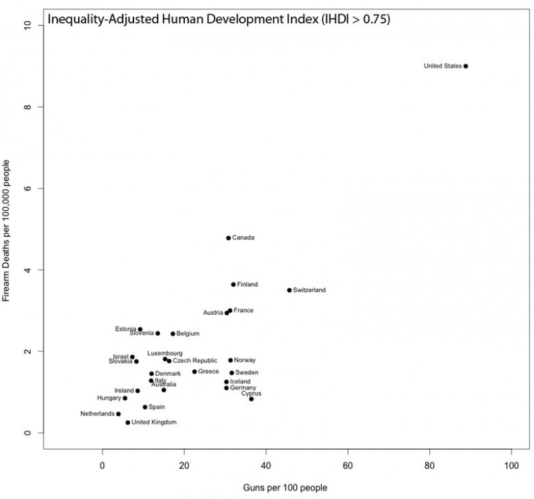 And, as a matter of pure statistics, it does appear that, for countries of equivalent social and economic development, more guns does positively correlate with more gun deaths in a more or less straight-line relationship: