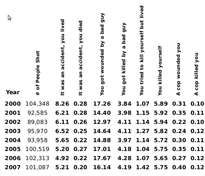 Source: Accidental v. Intentional, Fatal v. Non-Fatal, Gunshots, 2000-2007 in the USA ? Greg Laden's Blog