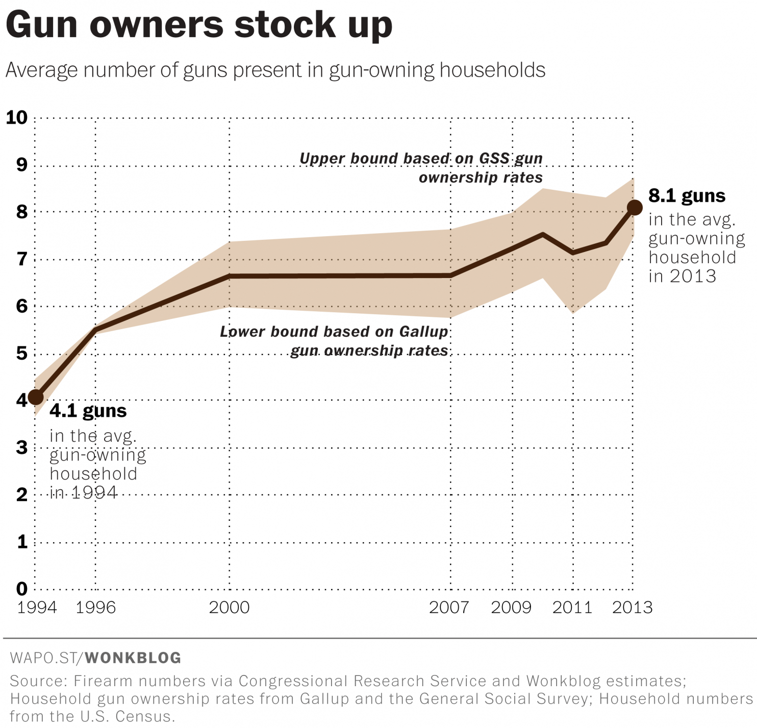 There are nearly twice as many guns in the average gun-owning household today as there were 20 years ago, according to new Wonkblog estimates based data from surveys and the Bureau of Alcohol, Tobacco, Firearms and Explosives. In 2013, there were an estimated 8.1 firearms in the typical gun-owning household, according to these data. In 1994, the average gun-owning household owned 4.2 guns.