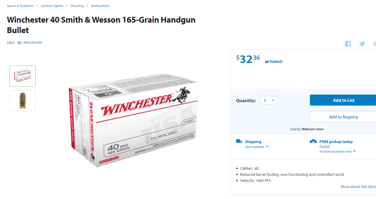 But in all seriousness, I have no idea what you're talking about. WalMart stores in NYS still sell ammunition. I looked up a random load at the store in Fishkill, near where I used to live in Wappingers Falls. 100 rounds of Winchester 165gr .40 S&W is $32.36 at WalMart, which is four dollars cheaper than the exact same box at bulkammo.com.