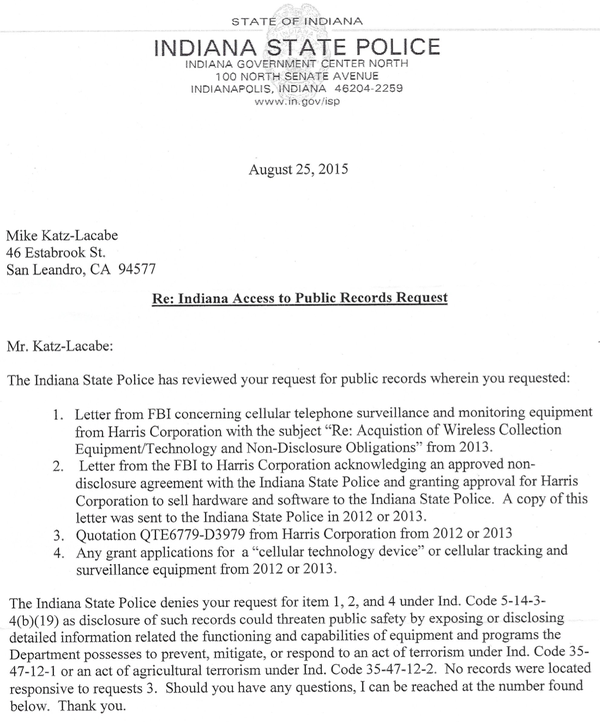 A California-based privacy activist who has filed hundreds of public records requests to learn about how cell-site simulators are used nationwide had a request denied earlier this week by the Indiana State Police.