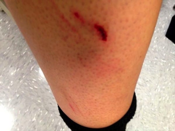 “When the officer arrived and rang the doorbell earlier than I expected, I ran downstairs, but my four year old son was already at the door with our dog. When my son opened the door and started to approach the Officer, the dog immediately put herself between him and the Officer and ended up biting the Officer twice on the leg – not viciously, but still creating bruises and breaking skin. The Officer was slowly backing up and trying to get her to calm down with outstretched hands. Luckily I was there an instant later and separated her.