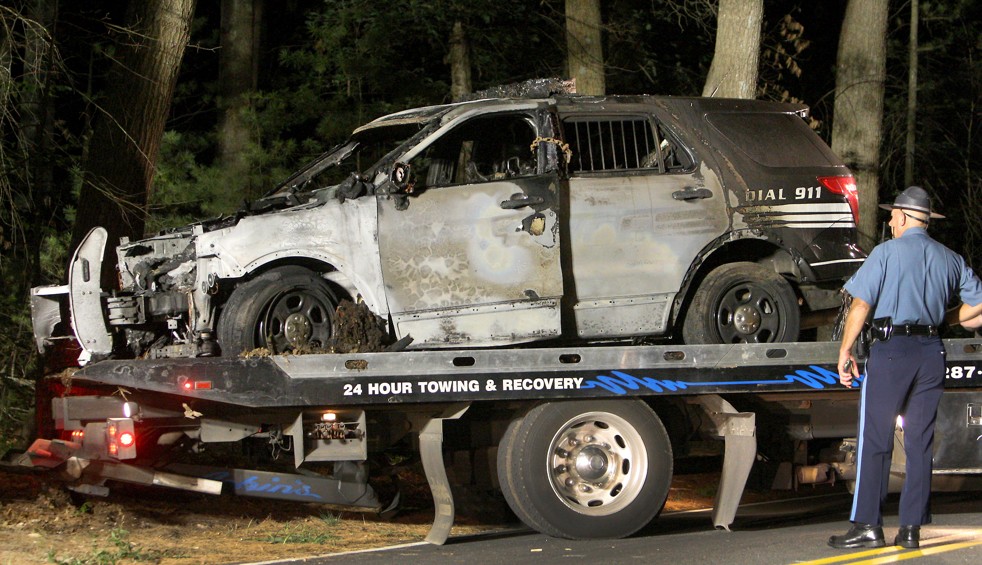 A police officer watches as a cruiser that was shot at is removed from Forest Road, Sept. 2 in Millis, Mass. (John Blanding/The Boston Globe via AP)
