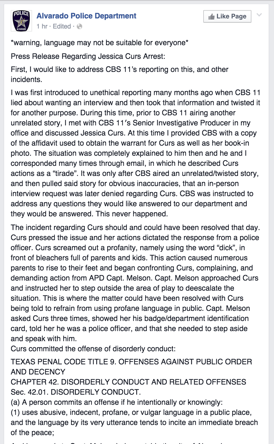 But even if she had said the word “dick” in public, she still would not have broken the law, making the arrest a blatant form of censorship – an act that his own department admitted to earlier today in a long and winding statement on its Facebook page with the dramatic headline: