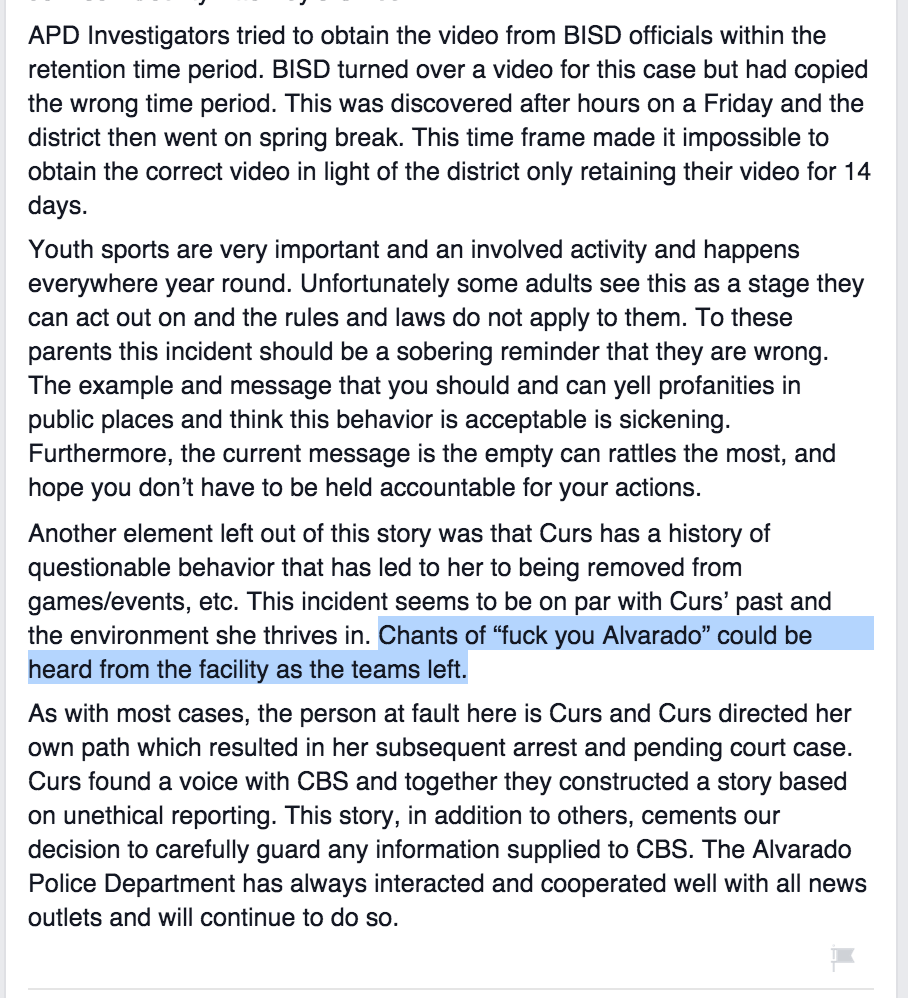 This action caused numerous parents to rise to their feet and began confronting Curs, complaining, and demanding action from APD Capt. Melson. Capt. Melson approached Curs and instructed her to step outside the area of play to deescalate the situation. This is where the matter could have been resolved with Curs being told to refrain from using profane language in public.