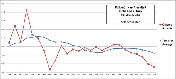 The FBI recently released its data on assaults on police officers in 2014. The good news is that reported assaults are down sharply. Unarmed and assaults with guns both dropped, while assaults with knives and edged weapons went up slightly. But overall, as this chart tweeted by University of South Carolina law professor Seth Stoughton shows, assaults on cops are at their lowest point since 1996 and have been dropping consistently since 2008.