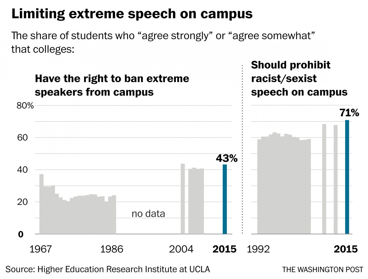A related survey question, which has been asked most years since 1967, inquired whether “colleges have the right to ban extreme speakers from campus.”