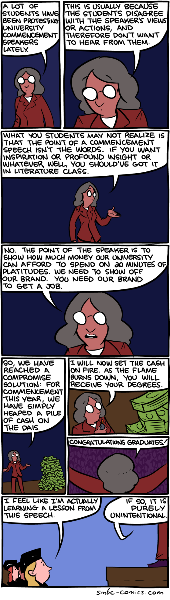 And I can't remember who handed me my undergrad diploma. It was probably the dean or someone like that. Second biggest university in the country at the time (UF), and we didn't have any memorable speakers.