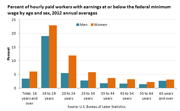 In 2012, there were 3.6 million hourly paid workers in the United States with wages at or below the federal minimum wage of $7.25 per hour. These workers made up 4.7 percent of the 75.3 million workers age 16 and over who were paid at hourly rates. In 2012, 6 percent of women who were paid hourly rates had wages at or below the prevailing federal minimum, compared with about 3 percent of men.