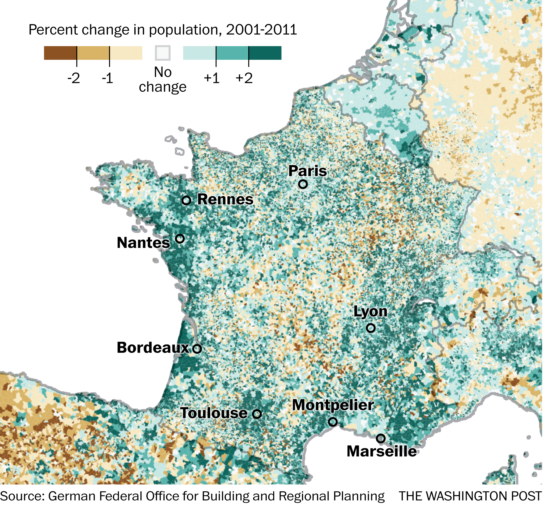 Like Britain, France is among the few countries in Europe with a growing population, thanks to immigration and a high fertility rate. What is particularly striking about the country is its nationwide population growth, even in rural areas.